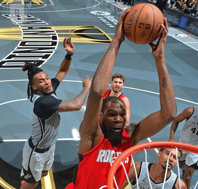 防守端马刺也是不给火箭任何大空位机会,想拿到一个轻松出手的投篮都很难。对杜兰特马刺采取和灰熊同样策略,就是无限夹击。杜兰特作为火箭的进攻箭头人物,出球能力不足一直是他的老毛病,他需要外线有另一个强大的牵制点,就像当年在勇士时有库里那样的射手分担压力。但火箭没有那样的牵制力,于是杜兰特压力极大,加上年龄上来,有心无力啊。可能上谢泼德时会好一些,但一旦火箭切换到五大阵容,马刺的夹击就变得肆无忌惮,火箭缺乏有效的破解手段。